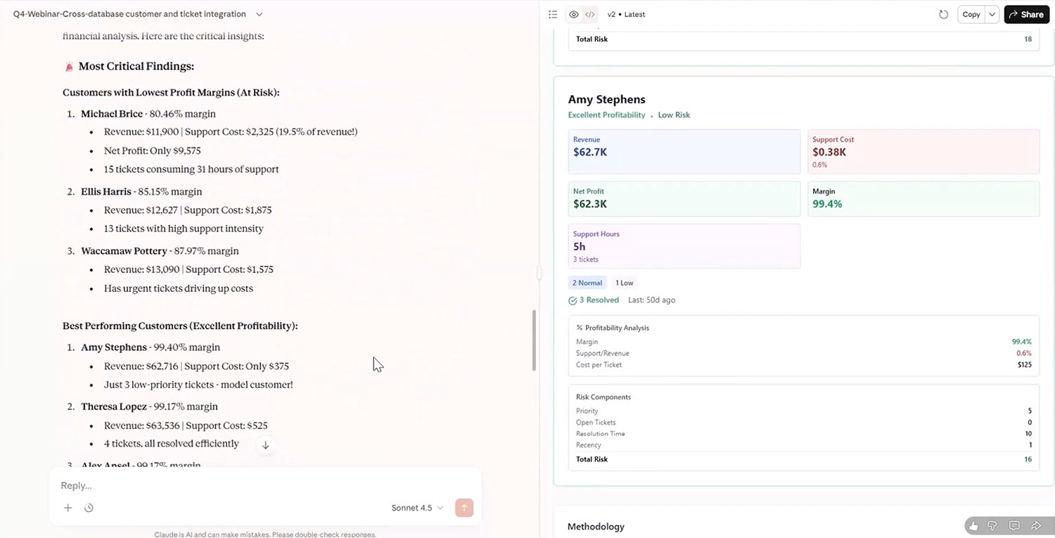 Meanwhile, another customer maintained a 99.4% margin with almost no support overhead. That gap between surface-level revenue and true profitability is invisible in a standard dashboard. It is exactly the kind of insight that changes how you allocate resources, prioritize accounts, and structure your service model.